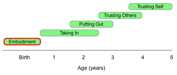 Integrate consciousness and a sense of self into the physical body. Requires a sense of safety and welcome.