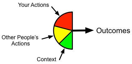 I’ve just arbitrarily sized the pie slices and they would be different in different situations. (It’s just half a pie to keep all the inputs coming in on the left.) If we wanted to map co-creation more thoroughly, we would have to include lots of feedback loops among these three inputs and time delays. I’m not going to do that here but just note that, even in this simple form, a composite map helps to communicate how, in co-creation, you have multiple influences rather than the categorical poles of absolute control or powerlessness.