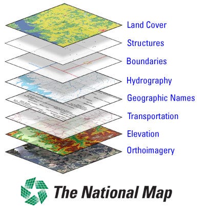 Layers are a lot like composites, except stacked instead of side by side. Layers have a long history in the world of geographic mapping as now exemplified by geographic information systems (GIS) that put different categories of information on different layers (which can be individually turned on or off) allowing a highly customizable composite map: