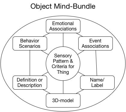 What we actually experience as an “object” is a mind-bundle. This is a term I introduced in hOS Literacy Part 2, starting at 9:39 and going to 12:35 and is a pattern of neural activations and associations that we experience as a unit. Here’s a diagram of some of the facets that our subconscious serves up to our awareness when we recognize an object: