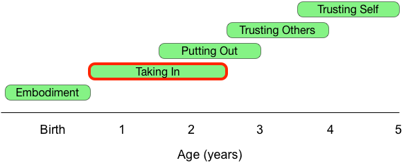 Initially, to take in and assimilate physical nourishment and love (archetypally through nursing) and then, based on that experience, open to life energy nourishment from the Earth and the Universe. Requires caregivers who can reliably provide both nourishment and love.