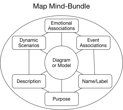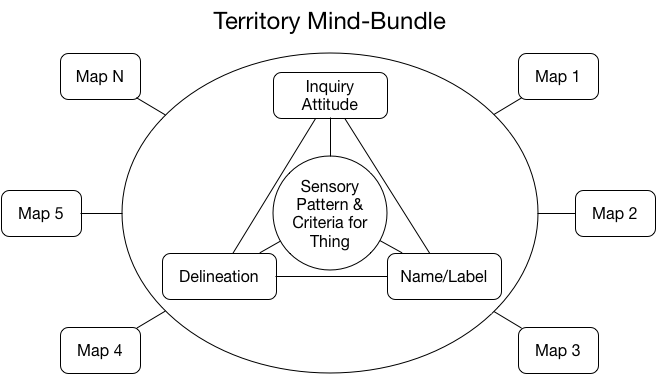 As a mind-bundle, a territory by itself (without its maps) mostly just says, “look here.” In this narrow sense, it is the mind-part of the thing, providing the boundary, the delineation. Yet it is more than that because of it’s associated maps; indeed it can be associated with an unlimited variety of maps. I think of the mind-bundle of a territory like this: