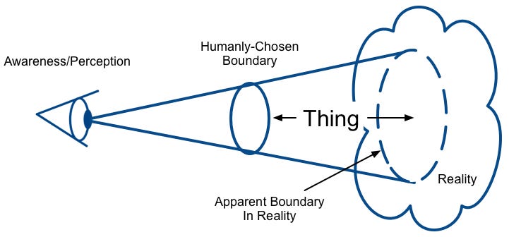 Let’s define a thing as a part or aspect of Reality. Since Reality doesn’t have its own internal boundaries, a thing needs to be a hybrid of
